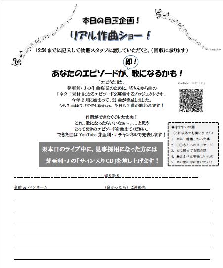 その場で会場から集めたエピソードで、10分で曲を作ります!という企画をやりました。